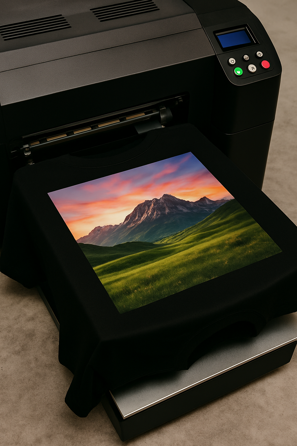 DTG printing is like using a regular printer — but instead of paper, it prints directly onto clothing. This process sprays the design straight into the fabric, allowing for full--colour, detailed artwork that feels soft to touch. Its perfect for custom t-shirts, hoodies and apparel with complex designs.