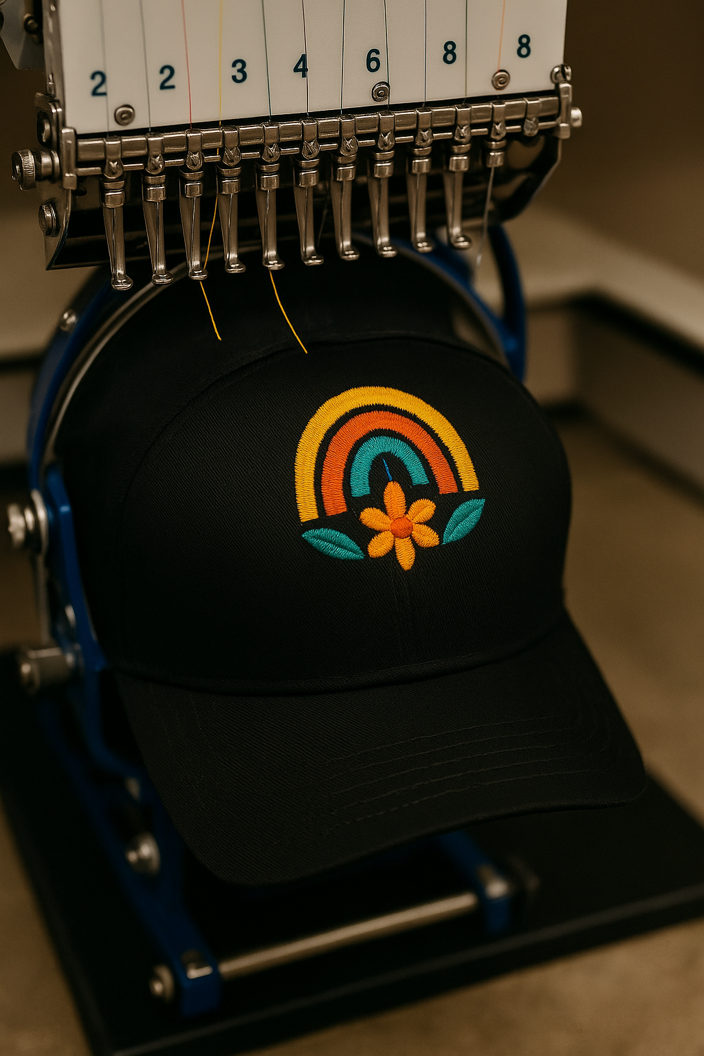 Embroidery is the process of stitching your design directly into the fabric with thread. It gives apparel a professional, textured look that’s durable and long lasting — perfect for logos, names, and branding on hats, polos, golf shirts, jackets, and more.