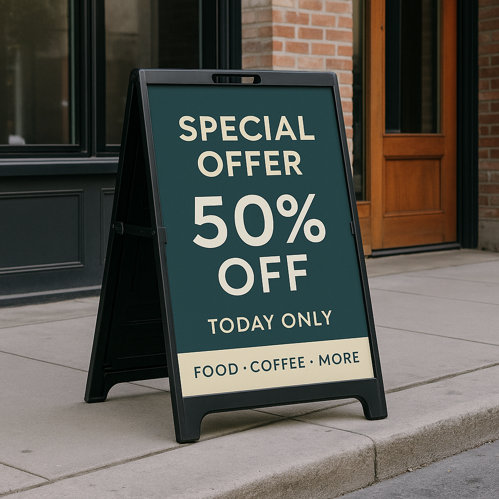 Also known as sandwich boards, are a portable and versatile way to promote your business or event. Perfect for sidewalks, storefronts, and entryways, they’re easy to set up, move, and store. Available with full colour printed panels, chalkboard surfaces, or interchangeable inserts. Its an affordable solution to grab attention.