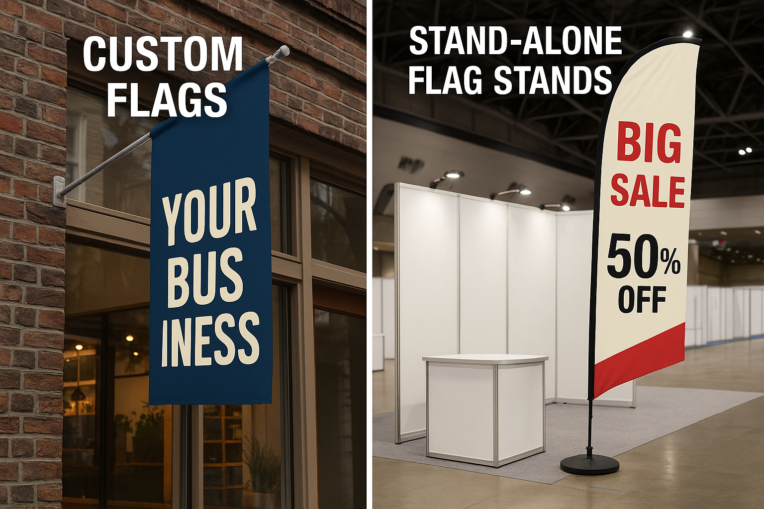 Wave your brand high with fully custom flags designed to grab attention indoors and outdoors. Available in a variety of shapes and sizes, our flags are made with durable, weather-resistant materials that keep your colours vibrant rain or shine. Perfect for storefronts, events, sports teams, or promotions.